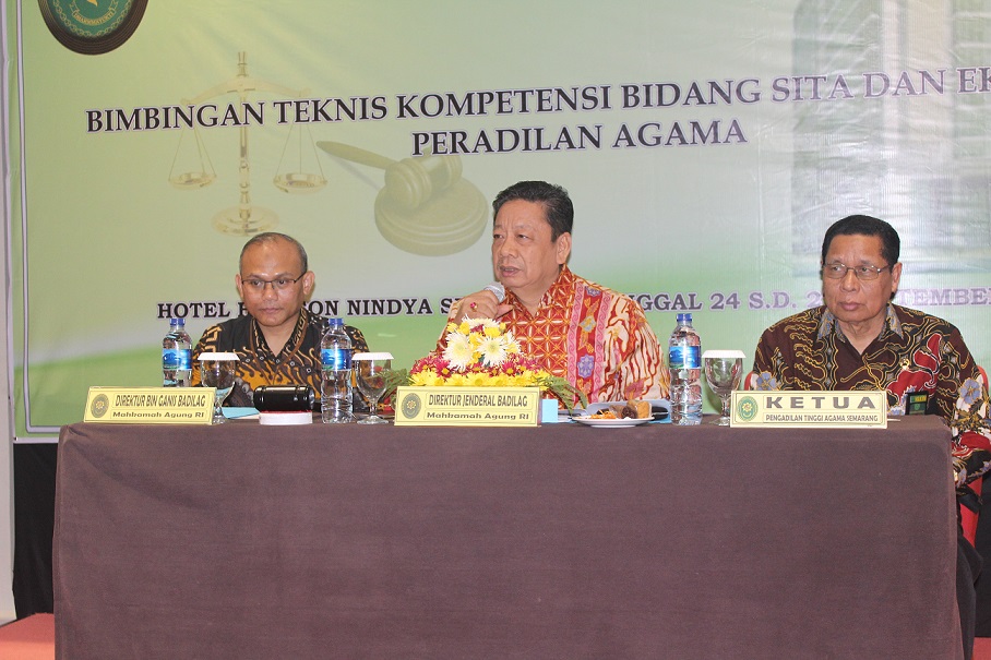 Dalam sambutannya, Dr. Bahruddin Muhammad, S.H., M.H., Ketua Pengadilan Tinggi Agama Semarang mengucapkan selamat datang dan mengucapkan terimakasih kepada Bapak Dirjen Badilag yang telah berkenan hadir memberikan pembinaan kepada segenap Pimpinan Pengadilan Agama di Jawa Tengah dan ucapan terimakasih atas dijadikannya Semarang menjadi tempat penyelenggaraan acara bimbingan teknis tersebut. Diungkapkan oleh Ketua PTA Semarang bahwa acara Bimbingan Teknis Sita dan Eksekusi ini mempunyai nilai yang sangat strategis karena saat ini Badan Peradilan berada dalam situasi mengahadapi perubahan tata cara persidangan dari secara manual ke tata cara persidangan secara elektronik yang selanjutnya pasti juga berpengaruh pula pada proses penyitaan maupun proses eksekusi;