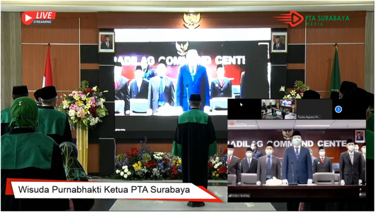 Meskipun dilaksanakan secara virtual, upacara wisuda purna bhakti ini berjalan dengan lancar dan khidmat. Dimulai pimpinan PTA Surabaya dan para hakim tinggi menempati tempat yang telah ditentukan, seluruh Ketua PTA se Indonesia bergabung melalui telekonfrensi. Setelah pejabat yang diwisuda memasuki ruangan upacara, kemudian Dirjen Badilag MARI dan Ketua Kamar Agama MARI bergabung secara virtual melalui telekonfrensi.