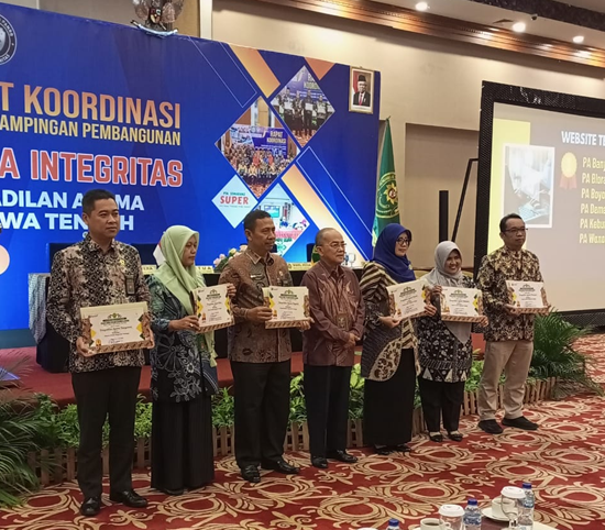 Piagam penghargaan diserahkan langsung oleh Dr. H. Empud Mahpudin, S.H., M.H selaku Ketua PTA Semarang masing-masing kepada Drs. Media Rinaldi, M.A (Ketua PA Boyolali), Rogaiyah, S.Ag., M.H. (Wakil Ketua PA Boyolali), dan Fitri Sayekti, S.T., S.H., M.M (Sekretaris PA Boyolali).