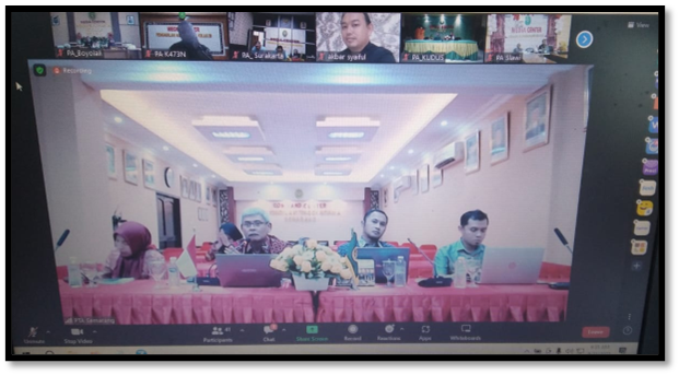 Bertempat di ruang media center Pengadilan Agama Boyolali, Panitera, Sekretaris dan Kasubbag PTIP (Jum’at, 11 Agustus 2023). mengikuti secara daring Sosialisasi Aplikasi Sistem Evaluasi Dan Monitoring Akuntabilitas Kerja (SEMAR) yang diadakan oleh Pengadilan Tinggi Agama Semarang pukul 09.00 WIB hingga selesai.