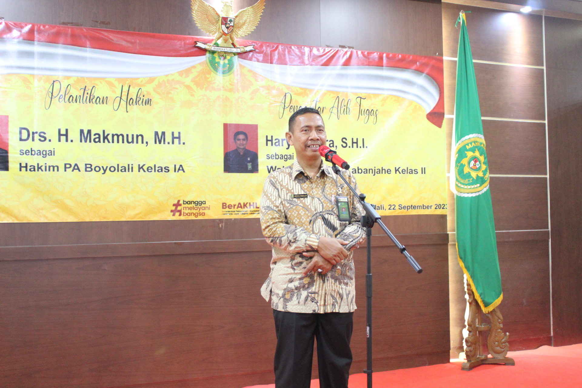 Menindaklanjuti hasil Rapat Tim Promosi Mutasi Hakim, Pengadilan Agama Boyolali menggelar acara Pelantikan sekaligus pengantar alih tugas Hakim pada tanggal 22 September 2023. Adalah Drs. H. Makmun, M.H. yang berdasarkan Surat Keputusan Ketua Mahkamah Agung Nomor : 174/KMA/SK/IX/2023 tanggal 04 September 2023 yang sebelumnya Hakim Pengadilan Agama Boyolali Kelas I A mutasi ke Pengadilan Agama Boyolali Kelas I A diperbantukan pada Pengadilan Agama Karanganyar Kelas 1 B. Pelantikan dilaksanakan di Aula Pengadilan Agama Boyolali dengan dihadiri segenap aparatur Pengadilan Agama Boyolali dan beberapa tamu undangan dari Pengadilan Agama Cilacap dan Pengadilan Agama Karanganyar.