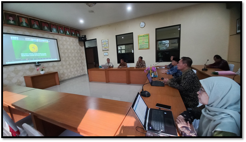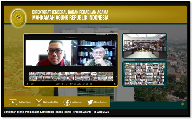 Pengadilan Agama (PA) Boyolali terus menunjukkan komitmennya dalam meningkatkan kualitas pelayanan dan keadilan bagi masyarakat pencari keadilan. Bertempat di Ruang Media Center, Ketua Pengadilan Agama Boyolali Bapak H. Zumrowi, S.Ag, M.H., bersama Wakil Ketua Ibu Rogaiyah, S.Ag, M.H., dan segenap jajaran hakim serta pegawai PA Boyolali mengikuti Bimbingan Teknis (Bimtek) melalui daring yang digelar oleh Direktorat Jenderal Badan Peradilan Agama Mahkamah Agung Republik Indonesia, Jumat (25/04/2025). Bimbingan Teknis dilaksanakan dengan tujuan untuk meningkatkan kualitas dan kapasitas tenaga teknis di lingkungan peradilan agama dalam permasalahan teknis yustisial. Tema yang diangkat dalam bimbingan teknis kali ini yaitu “Perlindungan Hak Asasi Manusia dalam Penyelesaian Hukum Keluarga".