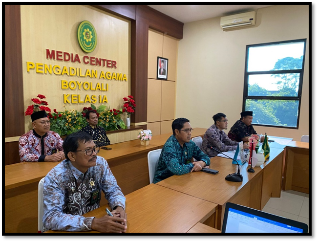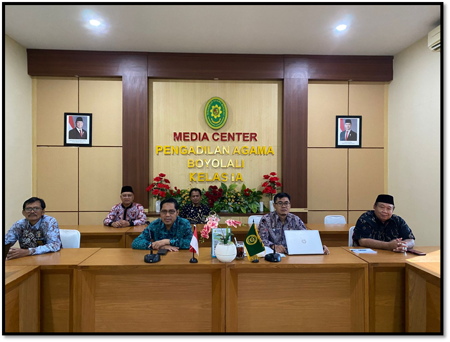 Hari Jum’at tanggal 11 Juli 2025 bertempat di ruang Media Center, Ketua Pengadilan Agama Boyolali Bapak Senen, S.Ag, M.H., bersama Wakil Ketua Bapak Dr. Jamadi, Lc., M.E.I., serta para Hakim dan tenaga teknis Pengadilan Agama Boyolali mengikuti Bimbingan Teknis (Bimtek) secara daring dengan tema “Kebijakan Pemerintah tentang Pembangunan Hukum terkait Pelayanan Keadilan bagi Kaum Rentan” yang diselenggarakan oleh Direktorat Jenderal Badan Peradilan Agama Mahkamah Agung RI. Sebagai narasumber dalam kegiatan bimtek adalah Bapak Rezafaraby, S.H., LL.M. (Koordinator Bidang Penerapan dan Penegakan Hukum, Direktorat Hukum dan Regulasi) dari Kementerian Perencanaan Pembangunan Nasional Republik Indonesia/Bappenas.