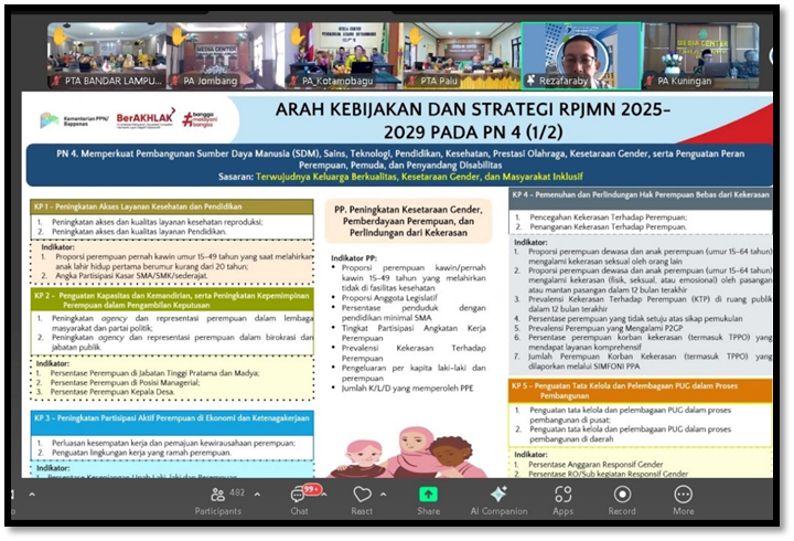 Memasuki penyampaian materi, Bapak Rezafaraby, dalam paparannya menjelaskan arah kebijakan pemerintah dalam mendukung pembangunan hukum nasional yang inklusif, berkeadilan, dan responsif terhadap kebutuhan kelompok rentan. Kelompok rentan yang dimaksud mencakup perempuan, anak, penyandang disabilitas, masyarakat miskin, dan kelompok marjinal lainnya. Melalui bimtek ini, peserta diharapkan mampu meningkatkan sensitivitas dan kualitas layanan hukum terhadap kelompok rentan, khususnya dalam konteks peradilan agama.