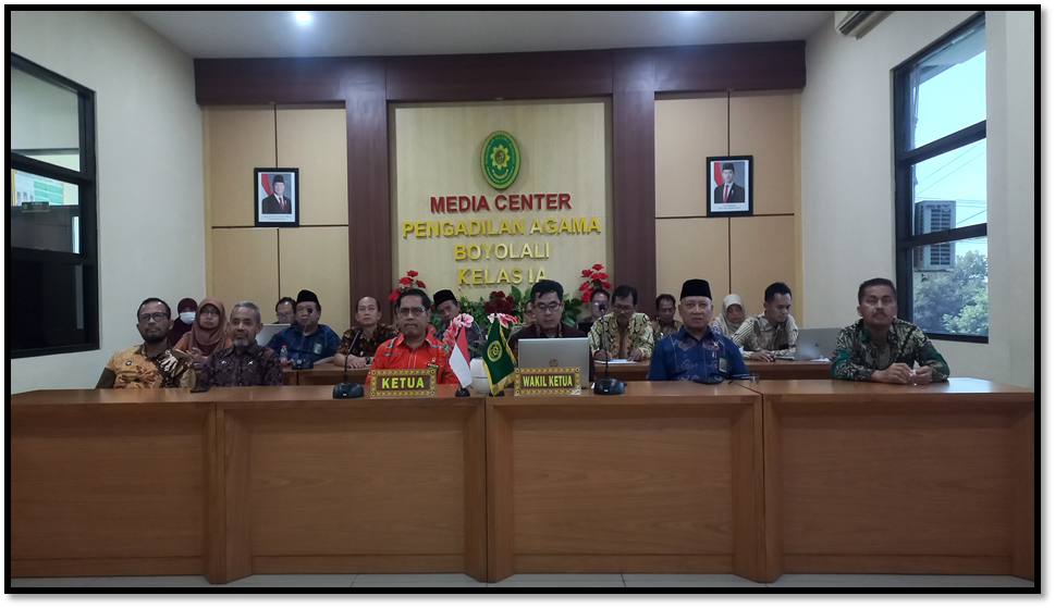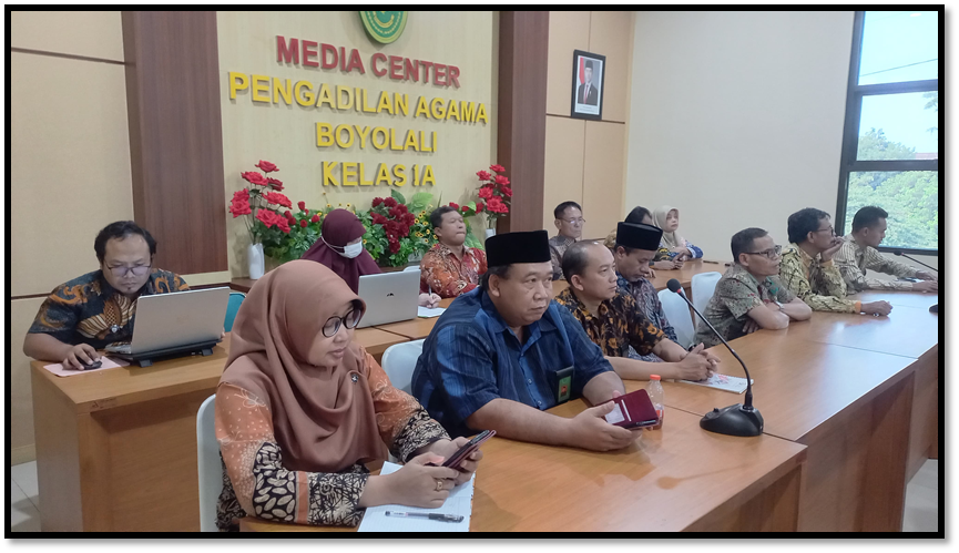 Boyolali, 24 Juli 2025 — Pukul 13.00 WIB bertempat di Ruang Media Center, Ketua Pengadilan Agama Boyolali Senen, S.Ag., M.H. di dampingi Wakil Ketua Dr. Jamadi, Lc, M.E.I., para Hakim, Plh. Panitera dan Sekretaris serta seluruh pegawai PA Boyolali mengikuti kegiatan Pembinaan terkait Kode Etik Hakim & ASN serta Evaluasi SAKIP secara daring melalui Zoom meeting, yang diselenggarakan oleh Pengadilan Tinggi Agama (PTA) Semarang, dengan narasumber dari Badan Pengawas Mahkamah Agung RI.