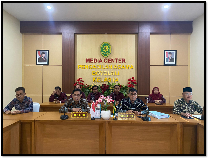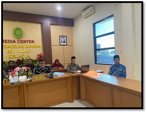 Bertempat di ruang Media Center Pengadilan Agama Boyolali, Ketua Pengadilan Agama Boyolali Bapak Senen, S.Ag, M.H., bersama Wakil Ketua, para Hakim, dan Seluruh Tenaga Teknis Pengadilan Agama Boyolali mengikuti Bimbingan Teknis yang diselenggarakan oleh Direktorat Jendral Badan Peradilan Agama secara virtual (zoom), Jumat, 01 Agustus 2025. Adapun tema Bimtek tersebut “Problematika Kaum Rentan Berhadapan dengan Hukum di Lingkungan Peradilan Agama". Bimtek ini diikuti oleh satuan kerja peradilan agama dari seluruh Indonesia. Kegiatan ini bertujuan meningkatkan kapasitas tenaga teknis dalam menangani perkara yang melibatkan kelompok rentan seperti perempuan, anak, penyandang disabilitas, dan masyarakat miskin.