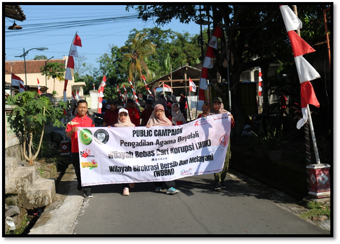 Ketua Pengadilan Agama Boyolali, menyatakan bahwa kegiatan ini merupakan wujud dari ikhtiar PA Boyolali sebagai lembaga peradilan dalam menciptakan pelayanan publik yang transparan, akuntabel, serta berintegritas tinggi. “Public Campaign” ini bukan sekadar simbolis, tapi juga bagian dari gerakan moral untuk menanamkan budaya kerja bebas korupsi kepada seluruh aparatur, sekaligus mengajak masyarakat menjadi bagian dari pengawasan publik. Dengan dilaksanakannya kegiatan ini, diharap masyarakat kabupaten Boyolali turut mengawal dan mendukung implementasi pembangunan Zona Integritasi di Pengadilan Agama Boyolali serta meningkatkan kepercayaan publik terhadap Pelayanan Pengadilan yang bersih dari Korupsi, Kolusi, dan Nepotisme dan bebas dari Pungli dan Gratifikasi. Mari kita dukung bersama upaya Pengadilan Agama Boyolali dalam membangun Zona Integritas Wilayah Bebas dari Korupsi (WBK) menuju Wilayah Birokrasi Bersih dan Melayani (WBBM).