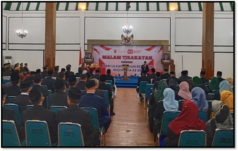 Boyolali, 17 Agustus 2025 – Dalam rangkaian peringatan Hari Ulang Tahun ke-80 Kemerdekaan Republik Indonesia, Pemerintah Kabupaten Boyolali menggelar Malam Tirakatan yang dilaksanakan di Pendopo Gedhe, Kompleks Perkantoran Terpadu Kabupaten Boyolali, pada Sabtu malam (16/8/2025). Kegiatan yang dihadiri sekitar 250 undangan ini berlangsung khidmat hingga pukul 23.30 WIB. Hadir dalam acara tersebut Bupati Boyolali Agus Irawan, Wakil Bupati Dwi Fajar Nirwana, Ketua DPRD Susetya Kusuma Dwi Hartanta, beserta tamu undangan jajaran Forkopimda, pimpinan partai politik, kepala OPD, hingga tokoh masyarakat Boyolali. Dalam kesempatan tersebut Pengadilan Agama Boyolali dihadiri langsung oleh Ketua Pengadilan Agama Boyolali Bapak Senen, S.Ag, M.H.
