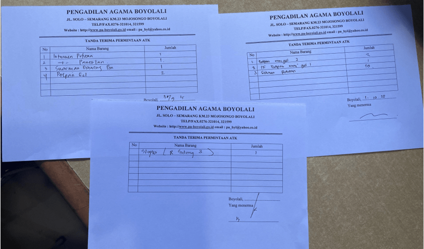 Inovasi ini tidak hanya memperbaiki tata kelola administrasi, tetapi juga memperkuat prinsip efisiensi, akuntabilitas, dan transparansi dalam pengelolaan sarana perkantoran. Pegawai mendapatkan kemudahan dalam proses pengambilan ATK, sementara pihak kepaniteraan memperoleh data yang lebih tertib dan dapat dipertanggungjawabkan. Melalui langkah digitalisasi pengambilan ATK ini, Pengadilan Agama Boyolali menunjukkan komitmennya untuk terus beradaptasi dengan perkembangan teknologi informasi, sekaligus mewujudkan birokrasi peradilan yang modern, efektif, dan terpercaya.