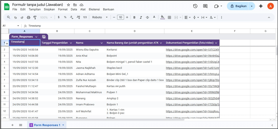Data pengambilan tersimpan secara otomatis pada database Google Drive yang dapat diakses real-time. Hal ini memudahkan bagian kepaniteraan dalam melakukan kontrol, penyetokan, serta monitoring ketersediaan ATK secara lebih cepat, akurat, dan transparan.