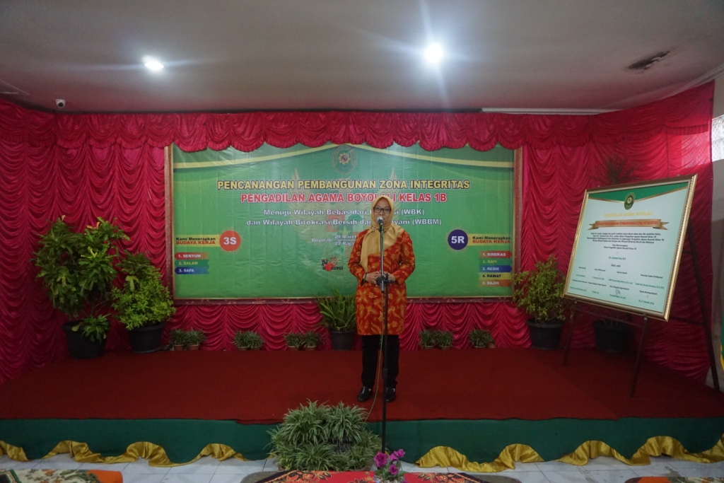 Acara dimulai sekitar jam 9 pagi waktu setempat, diawali dengan sambutan dari Ketua Pengadilan Agama Boyolali, Drs. Syamsul Aziz, M.H. Beliau menyampaikan bahwa segenap pegawai Pengadilan Agama Boyolali berkomitmen untuk mewujudkan Wilayah Bebas dari Korupsi dan Wilayah Birokrasi Bersih dan Melayani. Harapan kedepan agar pelayanan kepada masyarakat selalu ditingkatkan.