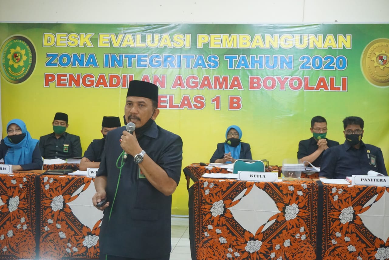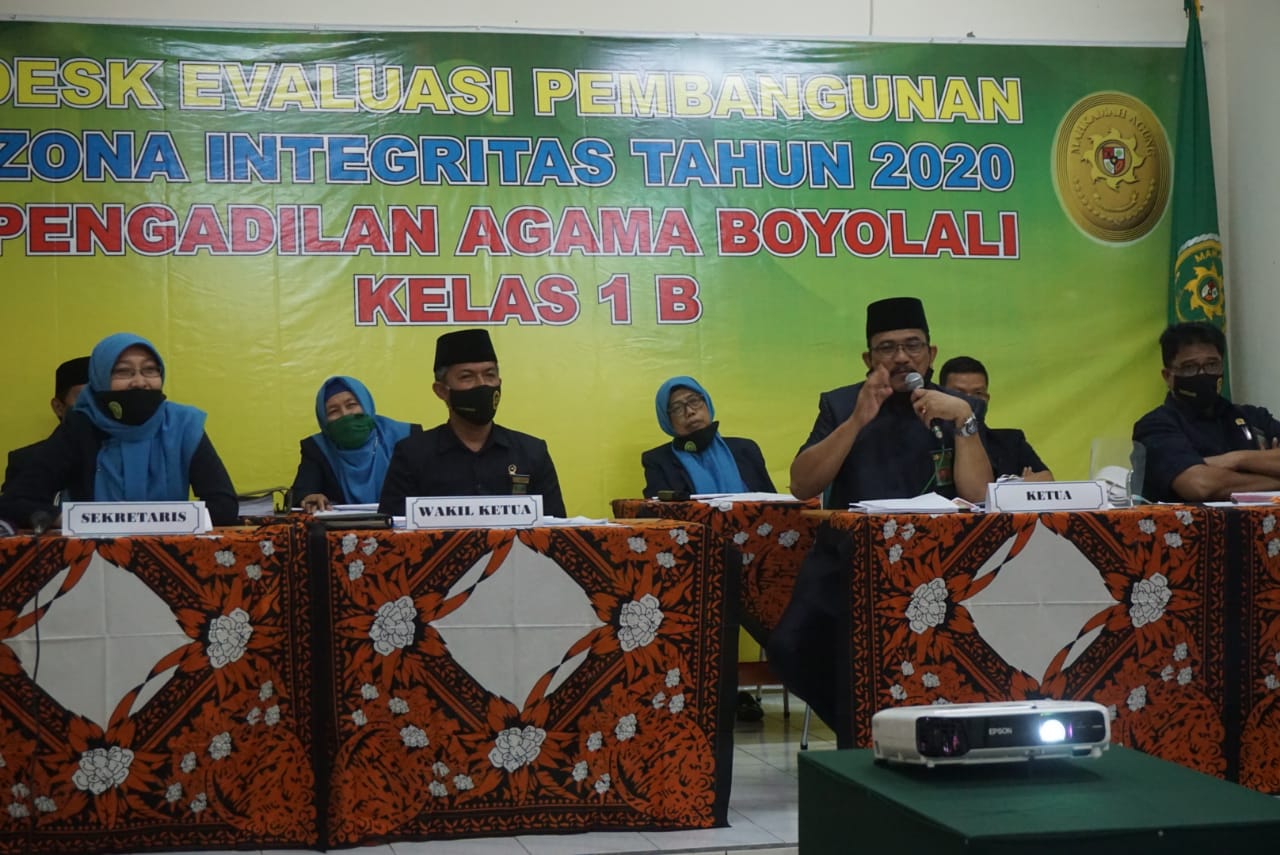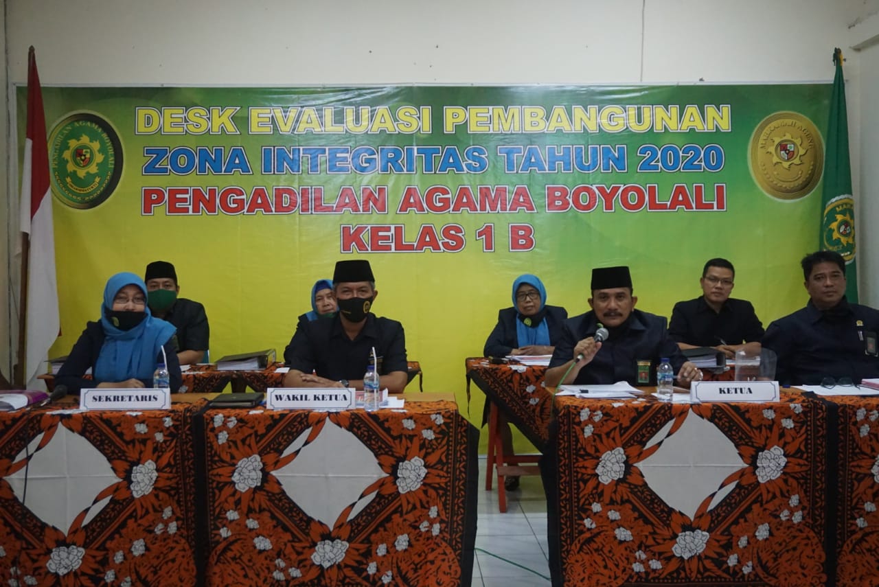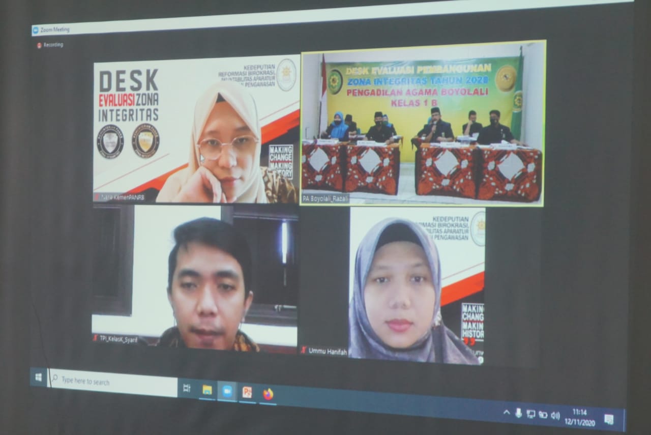 Kamis siang tanggal 12 November 2020 tepat pukul 10.30 WIB telah dilaksanakan Desk Evaluasi Pembangunan Zona Integritas pada Pengadilan Agama Boyolali secara online oleh Tim Penilai Nasional dari Kementerian Pendayagunaan Aparatur Negara dan Reformasi Birokrasi. Bertempat di ruang sidang 2, acara ini diikuti oleh Ketua Pengadilan Agama Boyolali, Ketua Tim Pembangunan Zona Integritas dan masing - masing Koordinator Area Pembangunan Zona Integritas Pengadilan Agama Boyolali.