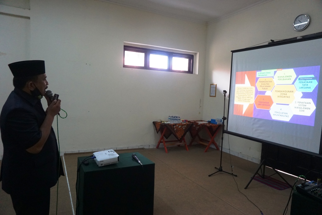 Ketika waktu presentasi sudah diberikan oleh Tim Penilai, Ketua Pengadilan Agama Boyolali, Muhammad Razali pun segera memulai memaparkan tentang pelaksanaan Pembangunan Zona Integritas pada Pengadilan Agama Boyolali yang mencakup 6 area yaitu :