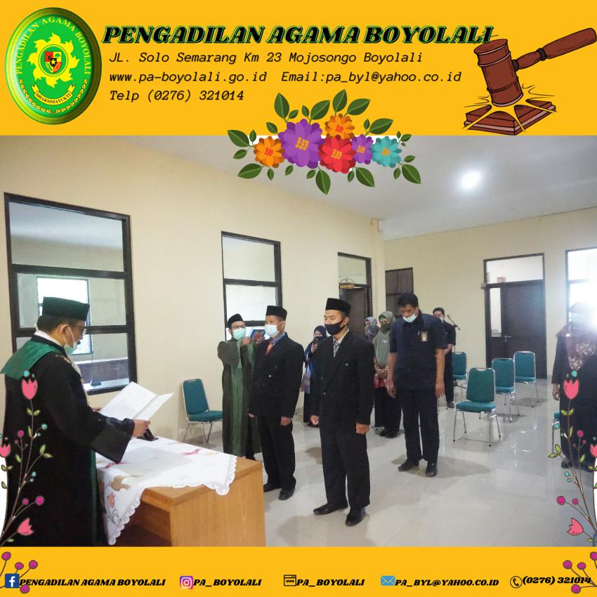 Diawali dengan ucapan Basmallah bersama acara dimulai dengan menyanyikan Lagu Kebangsaan Indonesia Raya dilanjutkan Hymne Mahkamah Agung, pembacaan Doa, dan pembacaan Surat Keputusan. Pejabat yang dilantik dan diambil sumpah jabatan pada hari ini adalah Bapak Muh. Dawam, S.H. sebagai Panitera Muda Permohonan Pengadilan Agama Boyolali yang sebelumnya menjabat sebagai Panitera Pengganti Pengadilan Agama Sragen. Bapak Fitriyadi Cahyo Nugroho, S.H. sebagai Panitera Pengganti Pengadilan Agama Boyolali yang sebelumnya menjabat sebagai Panitera Pengganti Pengadilan Agama Ponorogo.