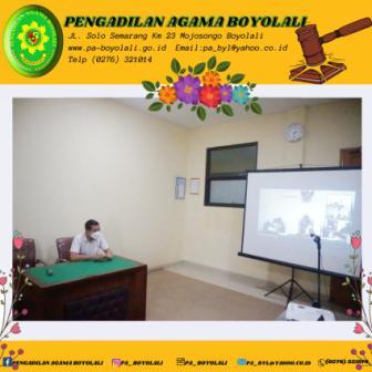 a hal ini, Senin, 05 Juli 2021 pukul 14.00 WIB Pengadilan Agama Boyolali melakukan sidang teleconference atau sidang jarak jauh dalam perkara cerai gugat dengan nomor perkara 1003/Pdt.G/2021/PA.Btm dengan menghadirkan tergugat di Ruang Sidang 2 Pengadilan Agama Boyolali, karena tergugat bertempat tinggal di wilyah hukum Pengadilan Agama Boyolali sehingga tidak bisa menghadiri sidang secara langsung ke Pengadilan Agama Batam. Pengadilan Agama Boyolali memfasilitasi sidang teleconference ini dengan menyiapkan perangkat alat audio, web cam, layar proyektor untuk mendukung jalannya persidangan.