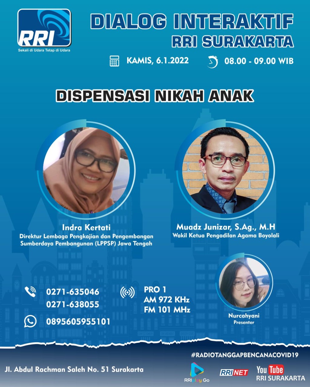 PA Boyolali Kembali Mengudara bersama Pro 1 RRI Surakarta pada Hari Kamis, 06 Januari 2022 pada Pukul 08.00 s.d. 09.00 WIB dengan Tema Dispensasi Nikah Anak dengan Narasumber Bapak Muadz Junizar, S.Ag., M.H. (Wakil Ketua PA Boyolali) dan Indra Kertati (Direktur LPPSP Jawa Tengah).