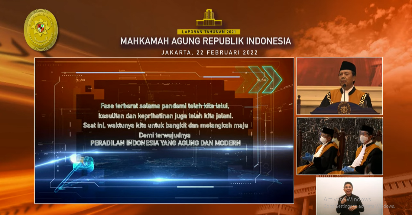 Acara yang disiarkan langsung dari Gedung Mahkamah Agung RI lewati aplikasi Zoom yang tertera pada undangan dan disiarkan langsung melewati kanal Youtube Mahkamah Agung RI. Kegiatan Laporan Tahunan Mahkamah Agung RI tahun 2021 mengambil tema “ Akselerasi Perwujudan Peradilan Modern”.