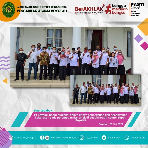 Pengadilan Agama Boyolali menghadiri acara audiensi dalam upaya pencegahan dan penanganan kekerasan pada perempuan dan anak, Rabu (25/05). Acara berlangsung di Gedung Putih Kantor Bupati Kab. Boyolali yang membahas keterkaitan dengan kepentingan perempuan dan anak di Kabupaten Boyolali. Kenapa dibahas?? Karena adanya kasus kekerasan pada perempuan dan anak tahun 2020-2021 diantara dengan jenis kasus pelecehan seksual/persetubuhan, kenakalan anak, KDRT (psikis, fisik, ekonomi), dan kekerasan fisik, psikis, penelantaran pada anak. Pada tahun 2020-2021 yang mendominasi kasus kekerasan paling tinggi adalah pelecehan seksual/persetubuhan.