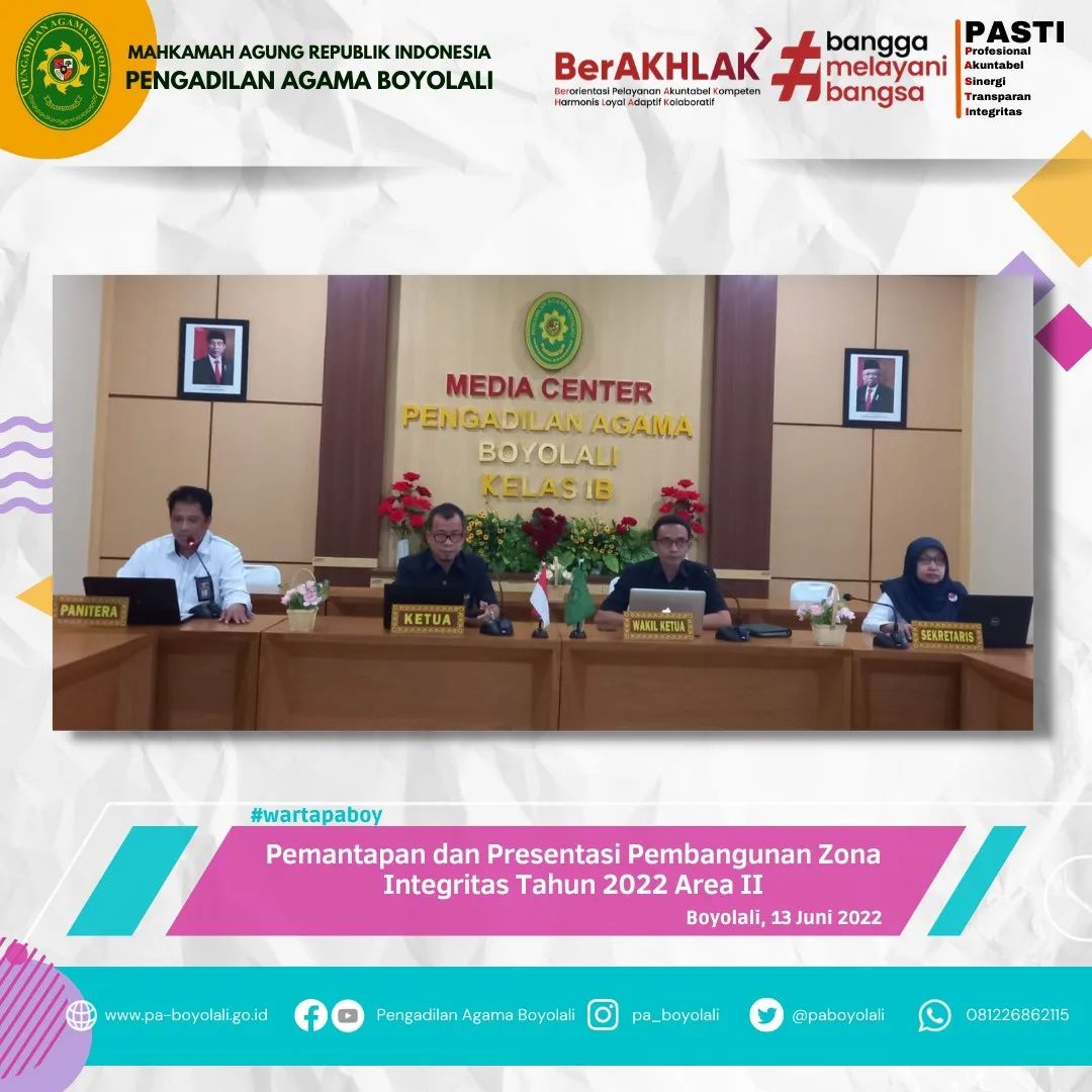 Acara tersebut dihadiri oleh Ketua PA Boyolali BapakEldi Harponi, S.Ag., M.H, Wakil Ketua PA Boyolali selaku Ketua Pembangunan Zona Integritas Bapak Muadz Junizar, S.Ag., M.H, didampingi Sekretaris Ibu Fitri Sayekti, S.T., S.H., M.M, dan Ketua Koordinator Area II beserta anggota. Koordinator area yang belum mendapatkan jadwal presentasi beserta anggota mengikuti acara tersebut melalui daring atau zoom meeting, Senin (13/06).