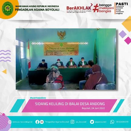 Pengadilan Agama Boyolali memberikan layanan prima dengan Sidang Keliling di Desa Andong, Kecamatan Andong, Kabupaten Boyolali, Jumat (24/06). Bertempat di Aula Balai Desa Andong, Sidang dipimpin oleh Wakil ketua Pengadilan Agama Boyolali Muadz Junizar, S.Ag., M.H. dengan Hakim Anggota Drs. Saefudin, M.H. dan Noor Ahmad Rosyidah, S.H.I. serta Panitera Pengganti Achmad Jawahir, S.H.I. Pelayananan sidang keliling kali ini menyidangkan total 6 perkara Cerai Talak dan Cerai Gugat dengan rincian putus 5 perkara dan 1 perkara belum putus, di tunda tgl 6 Juli 2022.