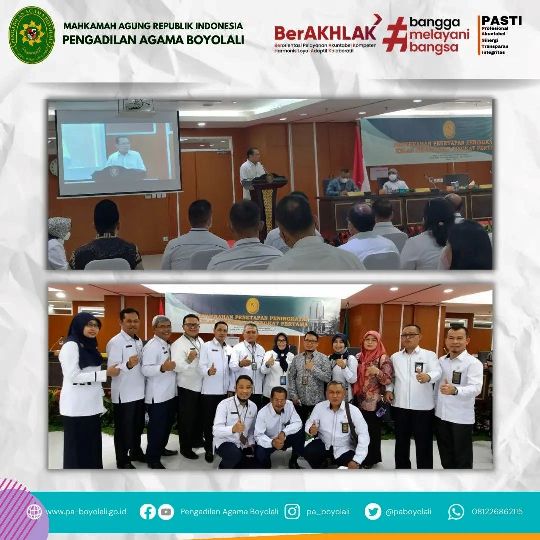 Alhamdulillah, Dalam rapat tersebut diserahkan Surat Keputusan Sekretaris Mahkamah Agung Republik Indonesia Nomor : 810/SEK/SK/VI/2022 tentang pemberlakuan peningkatan kelas Pengadilan Agama Boyolali, secara resmi Pengadilan Agama Boyolali naik kelas menjadi Pengadilan Agama Boyolali Kelas IA.