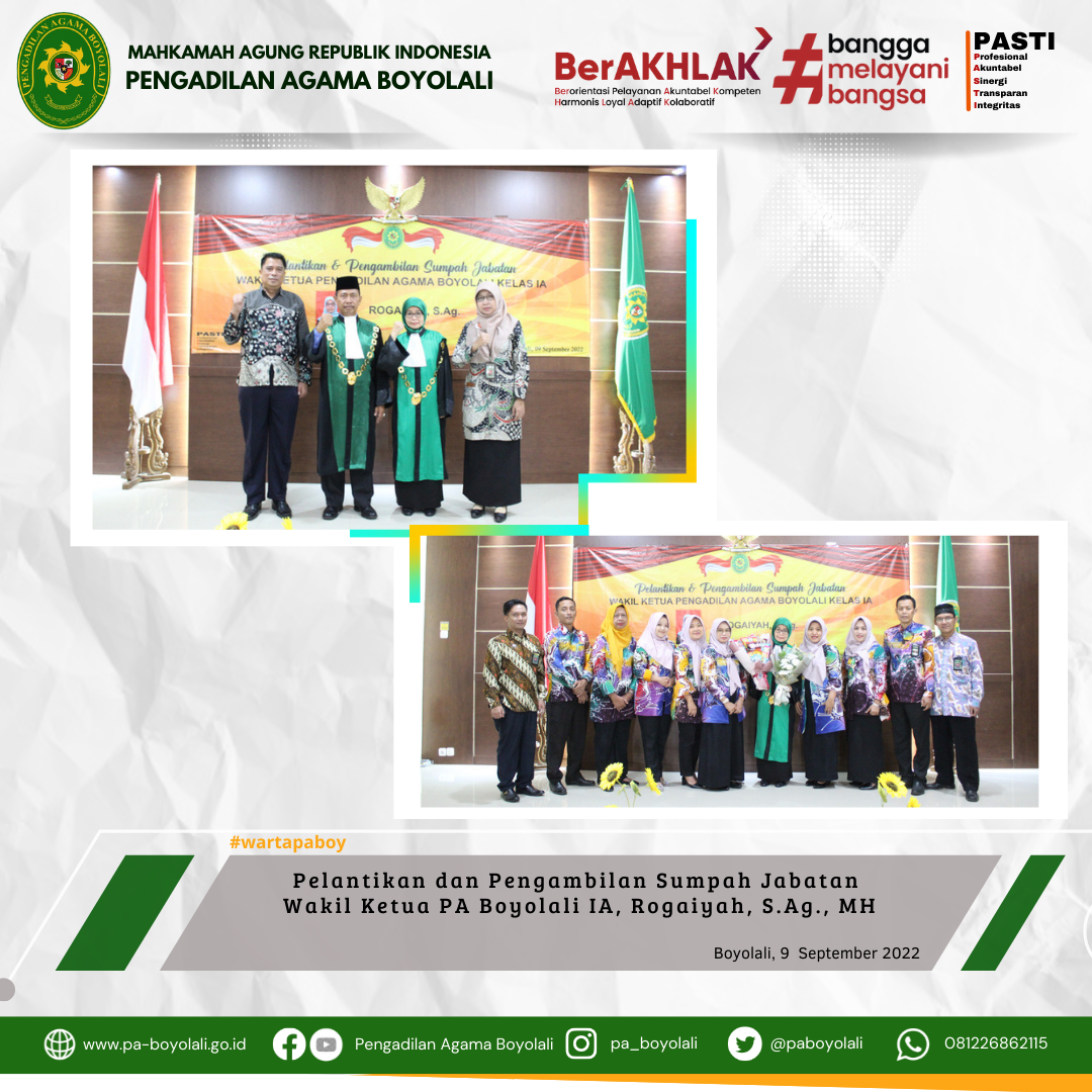 Keluarga Besar Pengadilan Agama Boyolali Kelas IA mengucapkan Selamat atas Pelantikan dan Pengambilan Sumpah Jabatan Ibu Rogaiyah, S.Ag., M.H sebagai Wakil Ketua Pengadilan Agama Boyolali Kelas IA. Semoga Allah SWT senantiasa memberikan Kesehatan, perlindungan, bimbingan dan tuntunannya. Aamiin.