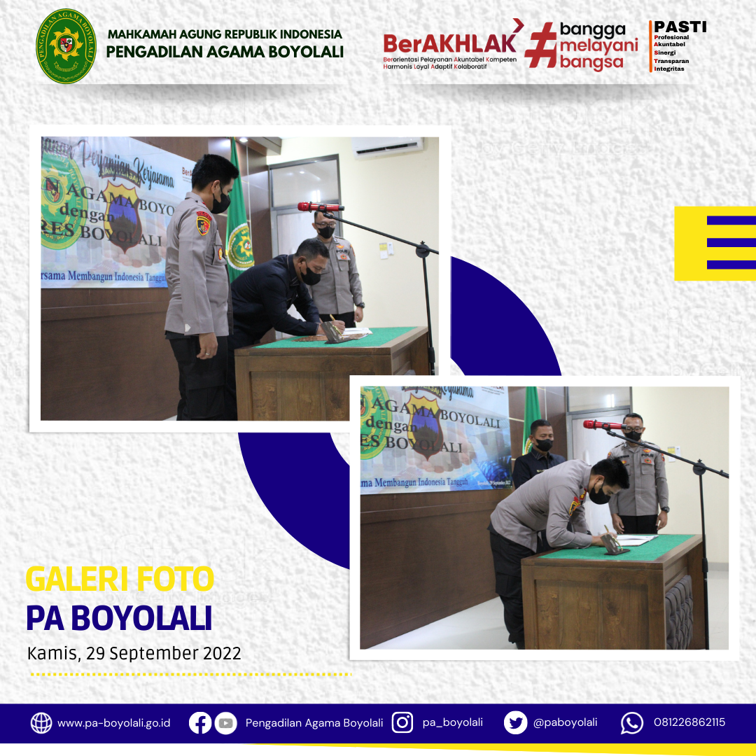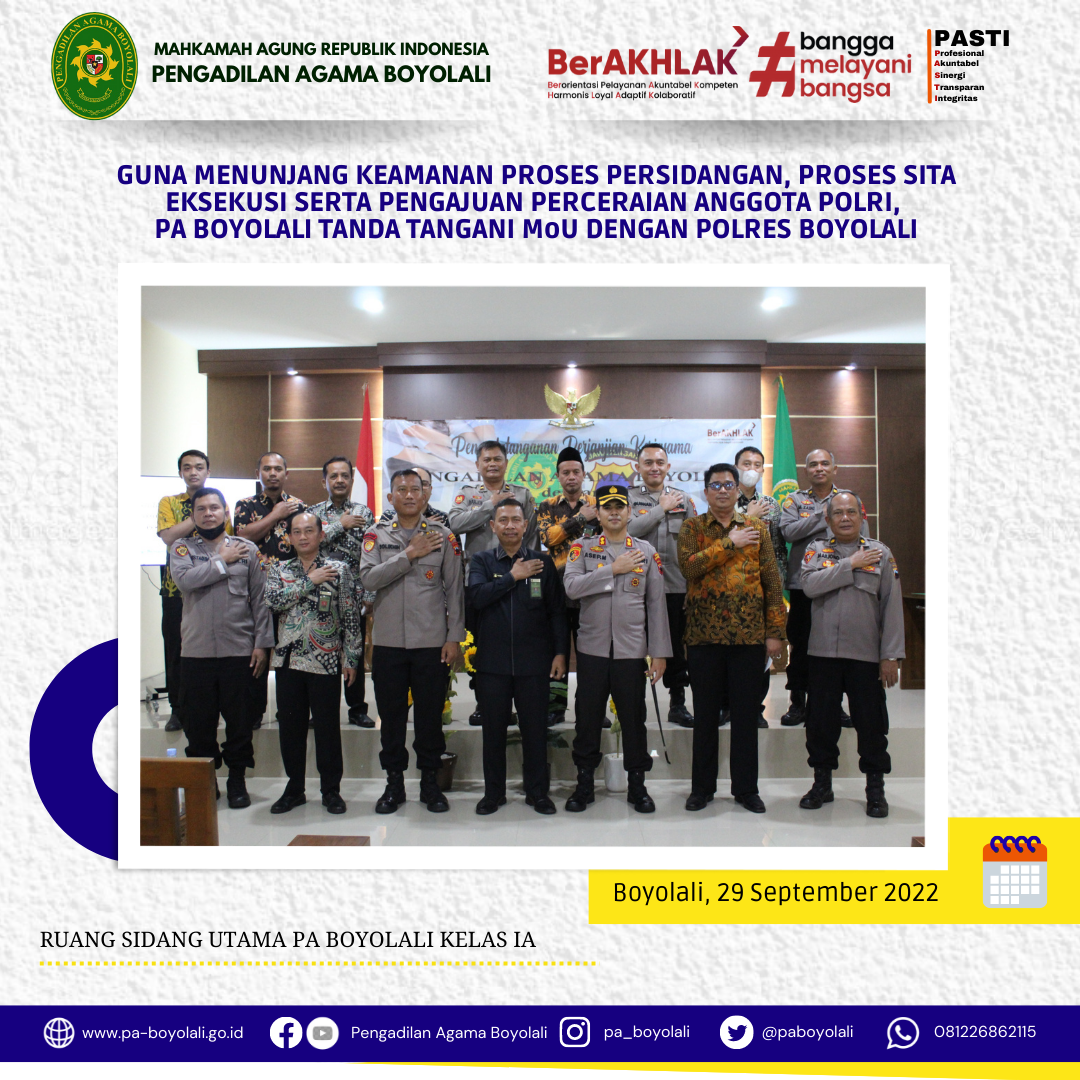 Kamis, 29 September 2022 pukul 09.00 WIB bertempat di ruang Sidang Utama Pengadilan Agama Boyolali Kelas IA telah dilaksanakan acara penandatanganan Memorandum of Understanding (MoU) antara Pengadilan Agama Boyolali Kelas IA dengan Polres Boyolali.