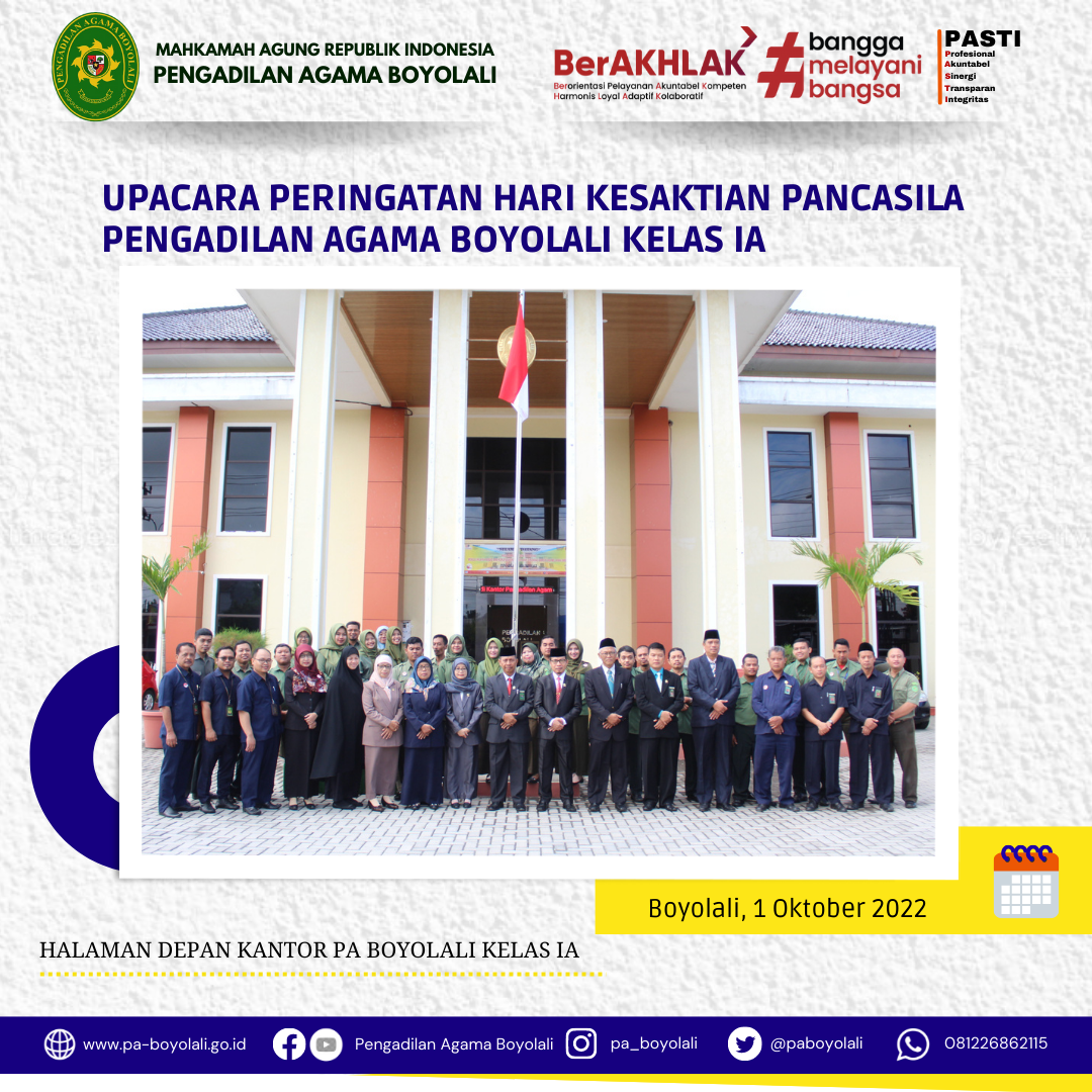 Berdasarkan surat Pengadilan Tinggi Agama Semarang Nomor W11-A/4420/HM.01.2/IX/2022 perihal Peringatan Hari Kesaktian Pancasila, Pengadilan Agama Boyolali Kelas IA menyelenggarakan upacara peringatan Hari Kesaktian Pancasila pada tanggal 1 Oktober 2022. Bertempat di halaman kantor Pengadilan Agama Boyolali Kelas IA, Ketua Pengadilan Agama Boyolali Drs. Media Rinaldi, M.A menjadi Inspektur Upacara yang diikuti oleh Wakil Ketua, seluruh Hakim, Pejabat Struktural dan Fungsional dan Pegawai, PPNPN Pengadilan Agama Boyolali Kelas IA beserta diikuti beberapa Hakim satker lain yang berdomisili di wilayah Boyolali. Upacara yang dimulai pukul 07.30 WIB tersebut berlangsung dengan khidmat dan lancar.