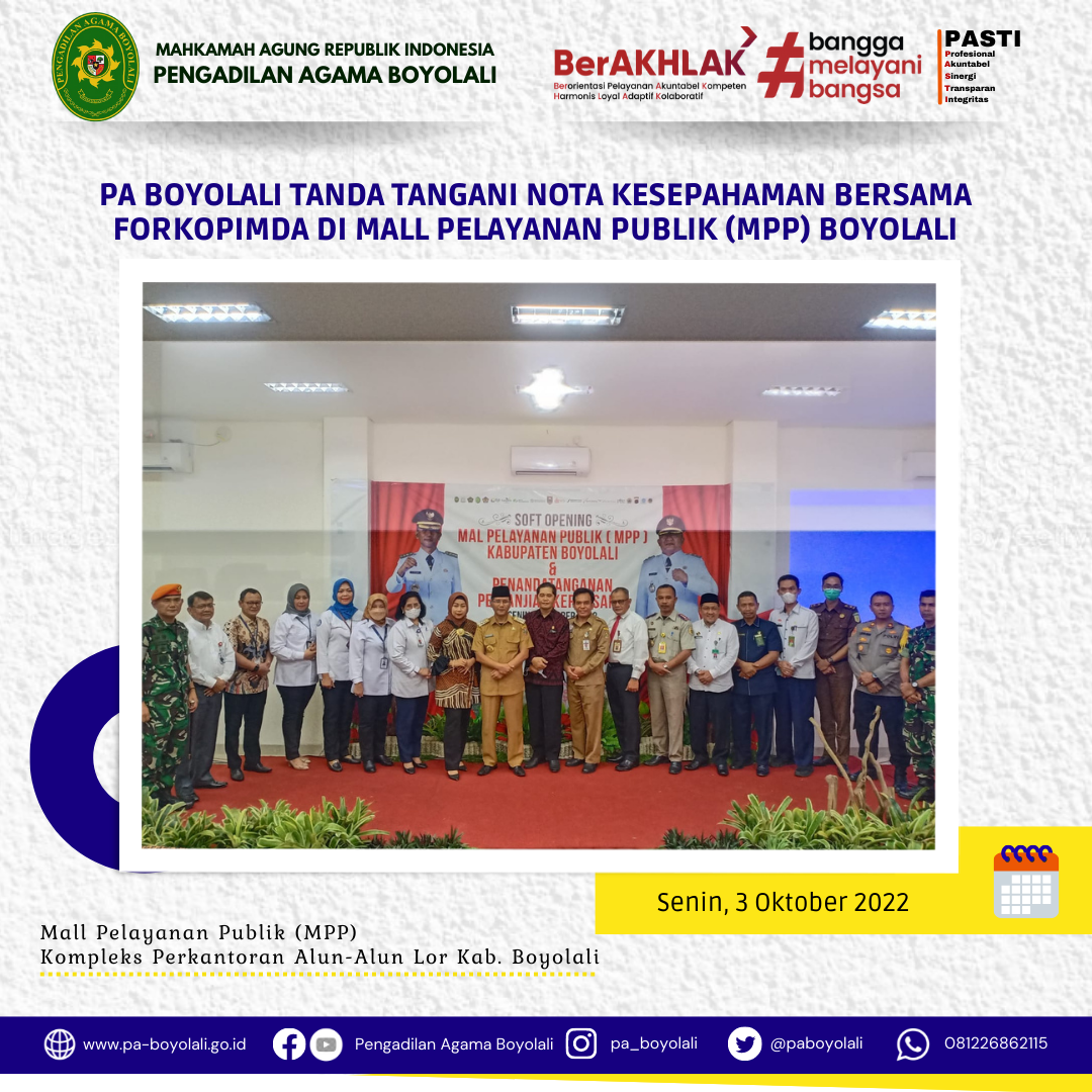 Dalam upaya meningkatkan pelayanan kepada masyarakat pencari keadilan, PA Boyolali menandatangani Nota Kesepahaman dengan Pemkab Boyolali dalam bentuk Mall Pelayanan Publik (MPP). Acara tersebut dirangkai dalam acara Soft Opening Mall Pelayanan Publik (MPP) Kabupaten Boyolali yang bertempat di Komples Perkantoran Alun-Alun Lor. Hadir dalam acara tersebut adalah Drs. Media Rinaldi, MA (Ketua PA Boyolali), Mochammad Fauzi, S.Ag (Panitera PA Boyolali), dan Fitri Sayekti, ST., SH., MM (Sekretaris PA Boyolali) hari Senin, 3 Oktober 2022.
