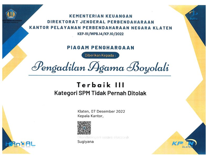 Dalam acara tersebut, Pengadilan Agama Boyolali mendapatkan 2 (Dua) penghargaan yaitu: