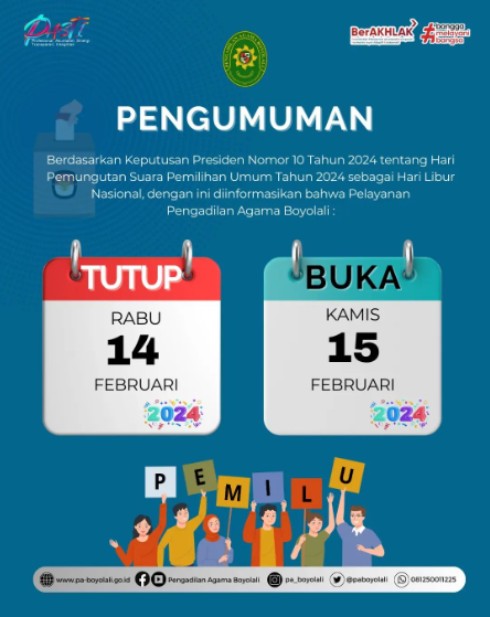 Berdasarkan Keputusan Presiden Nomor 10 Tahun 2024 tentang Hari Pemungutan Suara Pemilihan Umum Tahun 2024 sebagai Hari Libur Nasional, dengan ini diinformasikan bahwa Pelayanan Pengadilan Agama Boyolali pada hari Rabu tanggal 14 Februari 2024 - TUTUP / LIBUR - dan buka kembali pada hari Kamis tanggal 15 Februari 2024.