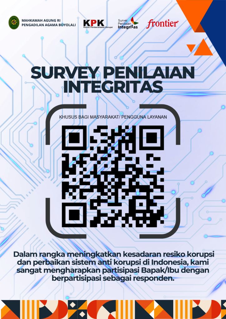Berdasarkan Surat Sekretaris Mahkamah Agung RI Nomor : 4333/SEK/PW1.1.1/XI/2024 tanggal 15 November 2024 hal Publikasi QR Code Survei Penilaian Integritas 2024, dengan ini kami sampaikan kepada seluruh masyarakat penerima layanan atau rekanan/penyedia pada Pengadilan Agama Boyolali untuk dapat berpartisipasi dalam pengisian Survei Penilaian Integritas(SPI) Mahkamah Agung RI 2024. Adapun Survei Penilaian Integritas (SPI) Mahkamah Agung RI bertujuan untuk meningkatkan kesadaran atas resiko korupsi, memetakan resiko korupsi, dan mengukur integritas Mahkamah Agung dan Badan Peradilan di bawahnya, agar Mahkamah Agung RI dapat merumuskan langkah-langkah untuk memperbaiki sistem anti korupsi sehingga dapat memberikan kualitas pelayanan publik yang lebih baik.