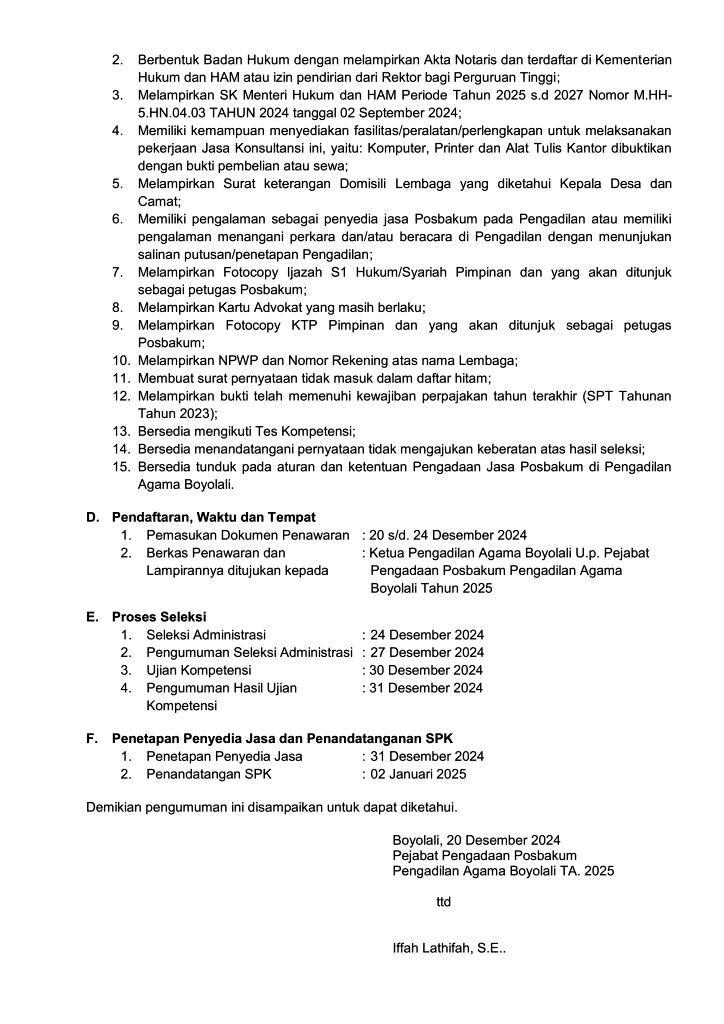 Berdasarkan amanat Pasal 23 Peraturan Mahkamah Agung RI Nomor 1 Tahun 2014 tentang Pedoman Pemberian Layanan Hukum Bagi Masyarakat Tidak Mampu di Pengadilan dan Daftar Isian Pelaksanaan Anggaran (DIPA) Pengadilan Agama Boyolali Tahun Anggaran 2025, Nomor : SP DIPA-005.04.2.401138/2025 tanggal 02 Desember 2024, dengan ini Pengadilan Agama Boyolali membuka Pendaftaran Calon Penyedia Jasa Konsultan Pos Bantuan Hukum (POSBAKUM) Tahun Anggaran 2025.