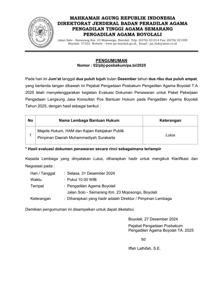 Pengumuman Hasil Seleksi Administrasi Calon Penyedia Jasa Layanan Bantuan Hukum Pengadilan Agama Boyolali Tahun 2025