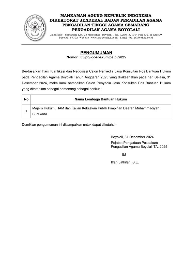 Pengumuman Hasil Akhir Seleksi Calon Penyedia Jasa Layanan Bantuan Hukum Pengadilan Agama Boyolali Tahun 2025