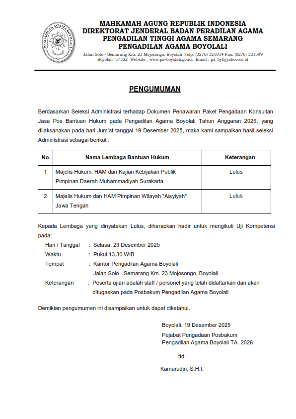 Pengumuman Hasil Seleksi Administrasi Calon Penyedia Jasa Layanan Bantuan Hukum Pengadilan Agama Boyolali Tahun 2026