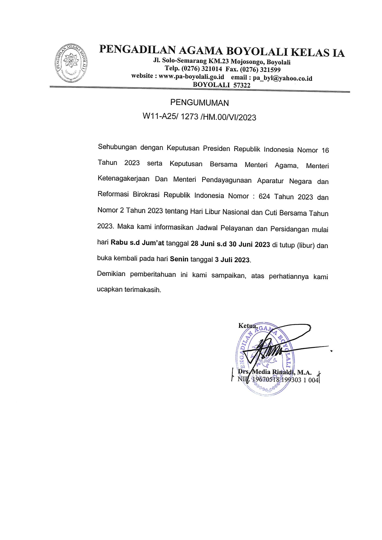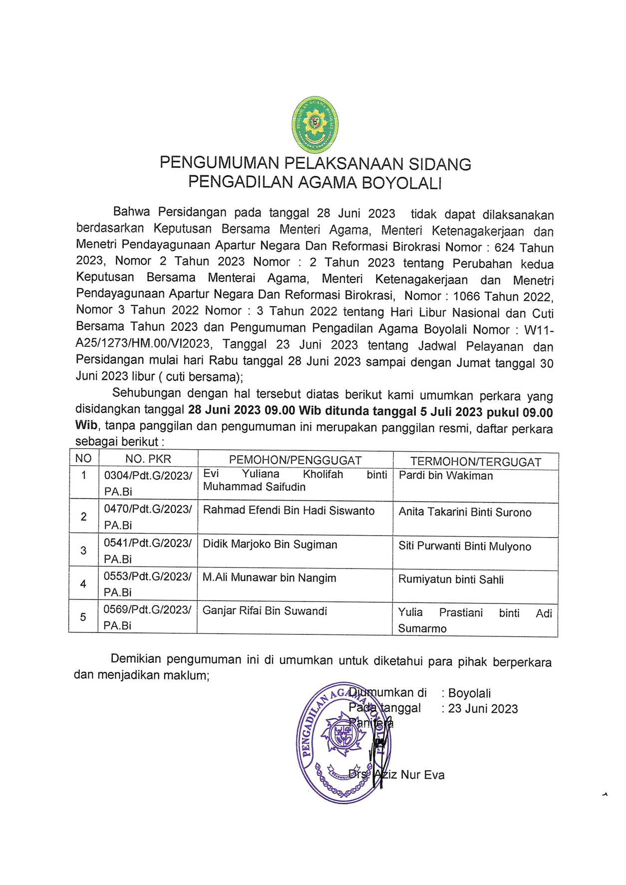 E-mail Cetak Pengumuman Penundaan Sidang 28 Juni 2023 Ditulis oleh Muhammad Makhrus on 27 Jun 2023. Ditulis oleh Muhammad Makhrus on 27 Jun 2023. Dilihat: 501 PENGUMUMAN Boyolali, 27 Juni 2023