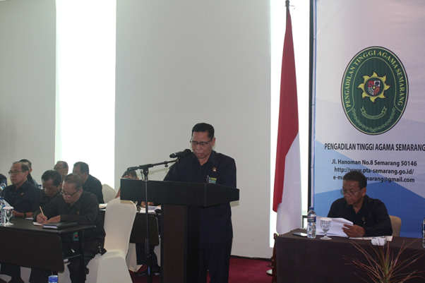 Acara yang dimulai pada pukul 08.30 tersebut dibuka oleh Ketua Pengaduilan Tinggi Agama Semarang DR.H.Bahruddin Muhammad, SH, MH. Dalam pengarahannya beliau menyampaikan bahwa acara diskusi ini adalah sebagai pelaksanaan instruksi Bapak Direktur Jenderal Badilag dalam suratnya Nomor 1324/Dja/OT.01.1/IV/2019  tanggal 12 April 2019. Dan pada kesempatan tersebut beliau mengingatkan kembali instruksi Bapak Dirjen Badilag MARI melalui suratnya tanggal 14 Maret 2019 perihal Penilaian Kinerja Satuan Kerja di Lingkungan Peradilan Agama, yang disusuli dengan surat tanggal 9 Januari 2019 tentang Sistem Penilaian Dalam Promosi dan Mutasi Tenaga Teknis di Lingkungan Peradilan Agama, dimana terdapat 13 item instruksi yang harus diperhatikan dan laksanakan, diantaranya : Pertama, Optimalisasi SIPP dimana berdasarkan Rapor Penanganan Perkara Berdasarkan SIPP Periode 26 April 2019, yang berwarna hijau sebanyak 20 Pengadilan Agama, sedangkan sisanya, 16 PA, berwarna kuning, alhamdulillah tidak ada yang berwarna merah. Mohon agar prestasi ini bisa diperbaiki lagi. Kedua, Optimalisasi penanganan perkara menggunakan e-court, agar semua satker Pengadilan Agama di Jawa Tengah melakukan sosialisasi kepada masyarakat serta mendorong dan mewajibkan para advokat supaya melakukan pendaftaran perkaranya melalui e-court, jangan sampai terjadi jumlah yang nihil untuk penangan perkara melalui e-court ini. Ketiga, Implementasi Pelayanan Terpadu Satu Pintu (PTSP) di PA se Jawa Tengah telah mendapatkan apresiasi dan pujian dari Bapak Dirjen Badilag setelah melakukan sidak pada 10 PA se Jateng, atas komitmen dan usaha keras yang  telah dilakukan oleh semua Pengadilan Agama Se Jawa Tengah saya sampaikan terima kasih dengan harapan semoga prestasi tersebut dapat dipertahankan dan ditingkatkan. Keempat, Implemenatasi Akreditasi Penjaminan Mutu tetap harus dilaksanakan secara berkelanjutan, oleh sebab itu nilai APM yang sudah diperoleh harus dipertahankan. Jangan sampai malah turun, misalkan karena kantor yang kotor padahal sudah mendapatkan predikat A Excellent, tidak disiplin datang dan pulang kantor, tidak melaksanakan apel Senin pagi dan apel Jumat sore, meja informasi yang tidak ada petugasnya, aparat yang keluar kantor tidak ijin atasan.