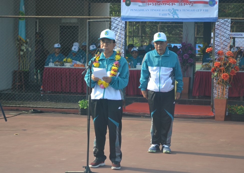 Sementara Dr. H. Bahruddin Muhammad, S.H.,M.H. selaku Ketua Pengadilan Tinggi Agama Semarag dalam sambutannya menyampaikan bahwa Turnamen kali ini terasa sangat istimewa, karena disamping adanya pengalungan bunga dari para penari kepada Pengurus PTWP Pusat, Ketua PTA Semarang & Wakil Bupati Banyumas juga disuguhkan Tarian Ngerong, Kesenian Tradisional Banyumasan dan Musik Kentongan Bambu, serta turnamen tahun ini juga dibuka secara resmi oleh Pengurus PTWP Pusat, YM. Hakim Agung Dr. H. Purwosusilo, S.H.,M.H. Lebih lanjut Bahruddin Muhammad berpesan kepada seluruh pemain agar selalu menjunjung rasa sportifitas bertanding, tujuan turnamen salah satunya untuk mencari bibit-bibit pemain baru yang diharapkan dapat menjadi pemain daerah Jawa Tengah yang diproyeksikan dapat berlaga di event Nasional yaitu Turnamen Tenis Mahkamah Agung Cup tahun 2020/2021 di Solo.