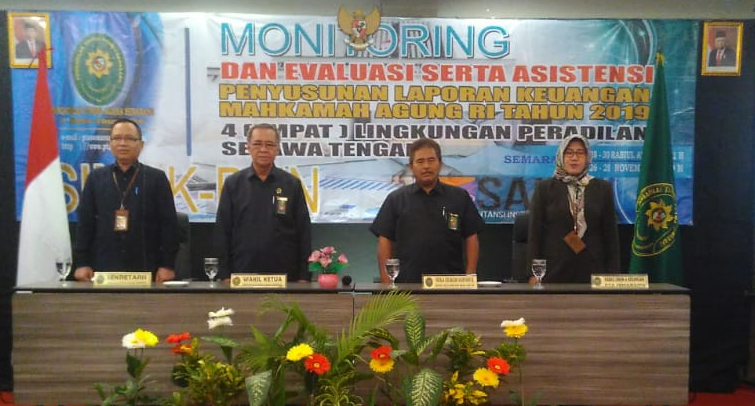 Selasa, 26 November 2019 menempati HCI Convention Semarang dengan memenuhi surat dari Kepala Biro Keuangan Badan Urusan Adminisrasi Mahkamah Agung RI, Pengadilan Tinggi Agama Semarang selaku Korwil menghadirkan para admin SIMAK-BMN dan SAIBA di 4 (empat) lingkungan peradilan di Jawa Tengah dalam rangka mengikuti kegiatan Monitoring Dan Evaluasi Serta Asistensi Pelaksanaan Penyusunan Laporan Keuangan Mahkamah Agung Tahun 2019. setelah peserta menempati ruangan, dengan sikap tegap dan semangat para pejuang pejuang ini melantunkan lagu kebangsaan indonesia raya dan hymne Mahkamah Agung RI. Lanjut acara secara resmi dibuka oleh Wakil Ketua Pengadilan Tinggi Agama Semarang (Drs. H. Iskandar Paputungan,SH.MH. tepat pukul 08.30 WIB bersama Tim Biro Keuangan Mahkamah Agung RI yanga akan memberikan pengarahan serta mengevaluasi.