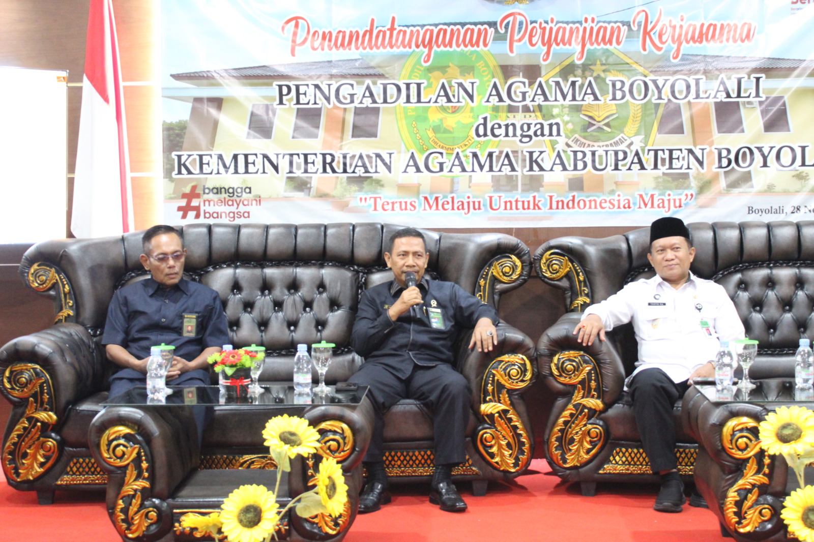 Kemudian dilanjutkan dengan sambutan oleh Ketua Pengadilan Agama Boyolali. Drs. Media Rinaldi, M.A. menyampaikan bahwa Pengadilan Agama dan Kementerian Agama adalah saudara, dimana dahulu Pengadilan Agama merupakan bagian dari Kementerian Agama (dahulu Departemen Agama) hingga pada akhirnya harus masuk ke Mahkamah Agung karena penyatuatapan Pengadilan. Namun walaupun kini sudah tidak berada dalam satu lembaga yang sama, silaturahmi antara dua instansi diharapkan tetap terjaga. Dan sejalan dengan apa yang disampaikan oleh Kepala Kantor Kementerian Agama Kabupaten Boyolali sebelumnya, semoga dengan adanya perjanjian kerja sama ini dapat meningkatkan pelayanan prima kepada masyarakat.