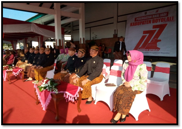 Dalam pelaksanaan upacara hari jadi, Bapak Drs. H. Syarifudin, M.H. mengenakan pakaian adat jawa yaitu beskap jawa jangkep. Usai pelaksanaan upacara, Bapak Drs. H. Syarifudin, M.H. beserta rombongan menuju Taman Makam Pahlawan Ratna Negara Kabupaten Boyolali untuk berziarah dan acara tersebut diakhiri dengan tabur bunga di pusara para pahlawan.