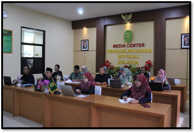 Boyolali - Ketua PA Boyolali H. Zumrowi, S.Ag., M.H. bersama Wakil Ketua PA Boyolali Rogaiyah, S.Ag., M.H. selaku Ketua Tim Pembangunan Zona Integritas PA Boyolali Tahun 2024, Panitera Drs. Aziz Nur Eva selaku Koordinator Teknikal, Sekretaris Fitri Sayekti, S.T., S.H., M.M. selaku Koordinator Operasional dan para Koordinator beserta anggota masing-masing Area Tim Pembangunan Zona Integritas PA Boyolali Tahun 2024 mengikuti Pendampingan satker yang lolos seleksi administrasi Wilayah Bebas dari Korupsi (WBK) Tahun 2024 secara daring di Media Center PA Boyolali pada Selasa, (10/9/2024). Kegiatan ini diselenggarakan oleh Direktorat Jenderal Badan Peradilan Agama Mahkamah Agung RI secara daring dan dihadiri oleh Ketua dan seluruh tim Pembangunan Zona Integritas 71 (tujuh puluh satu) satuan kerja di Lingkungan Badan Peradilan Agama yang lolos seleksi administrasi menuju Wilayah Bebas dari Korupsi (WBK) Tahun 2024.