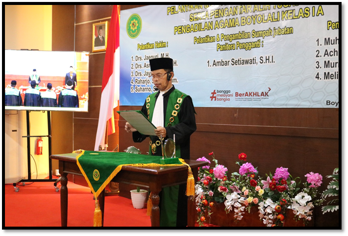 Ketua Pengadilan Agama Boyolali H. Zumrowi, S.Ag, M.H. melantik 5 orang Hakim yaitu Raharjo, S.H., M.Hum, Drs. Jayin, S.H., Drs. Jaenuri, M.H., Drs. Asrori, S.H.,M.H., dan Suharno, S.Ag. Selain itu dilakukan juga pelantikan dan pengambilan sumpah jabatan Panitera Pengganti yaitu Ambar Setiawati, S.H.I. Seluruh rangkaian acara pelantikan dan pengambilan sumpah jabatan berjalan dengan khidmat.
