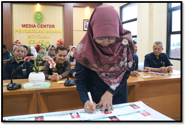 Boyolali - Pengadilan Agama Boyolali mengawali tahun 2025 dengan langkah penuh komitmen melalui kegiatan Penandatanganan Pakta Integritas, Perjanjian Kinerja, dan Komitmen Bersama. Acara ini berlangsung pada hari Rabu, 8 Januari 2025, bertempat di Ruang Media Center, dan diikuti oleh seluruh jajaran hakim serta pegawai Pengadilan Agama Boyolali.