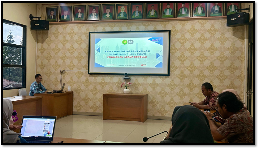 Jumat, 10 Januari 2025 Pukul 13.30 WIB, dilaksanakan kegiatan rapat Tindak Lanjut Survei Kepuasan Masyarakat (SKM), Survei Persepsi Anti Korupsi (SPAK) dan Survei Persepsi Kualitas Pelayanan (SPKP) Triwulan IV Tahun 2024. Bertempat di Ruang Media Center Pengadilan Agama Boyolali, kegiatan tersebut dipimpin langsung oleh Wakil Ketua PA Boyolali, Rogaiyah, S.Ag, M.H., dengan diikuti oleh Ketua dan seluruh anggota Tim Survei Kepuasan Masyarakat Pengadilan Agama Boyolali.