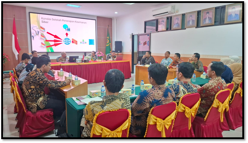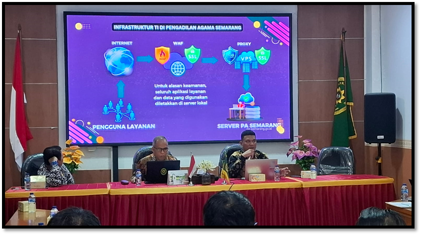 Sekretaris Pengadilan Agama Semarang dalam sambutannya menyambut baik kunjungan ini dan menekankan pentingnya kerja sama antar pengadilan dalam memperkuat infrastruktur serta keamanan jaringan. Dalam sesi pemaparan, Sekretaris dan Tim IT Pengadilan Agama Semarang menjelaskan langkah-langkah yang telah diterapkan untuk meningkatkan keamanan jaringan. Beberapa di antaranya adalah penerapan firewall, kontrol akses fisik dan hak akses ketat, serta pemanfaatan secure file sharing dan cloud security guna melindungi data dan sistem dari ancaman siber.