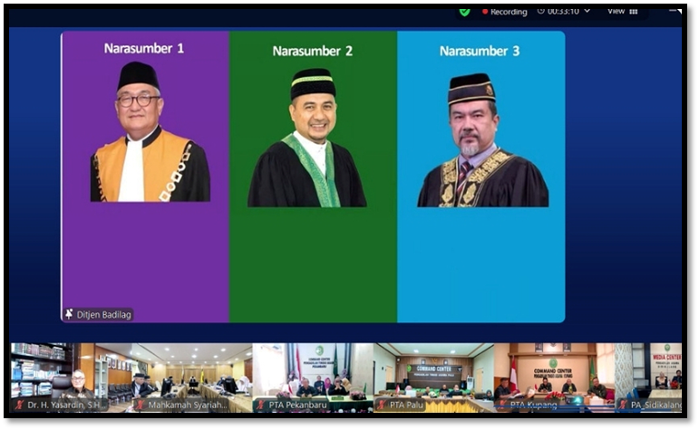 Kegiatan Webinar ini menghadirkan sejumlah narasumber kompeten dari ketiga negara. Dari Indonesia, hadir Ketua Kamar Agama Mahkamah Agung, Dr. H. Yasardin, S.H., M.H. dan Direktur Jenderal Badan Peradilan Agama, Drs. H. Muchlis, S.H., M.H. Brunei Darussalam diwakili oleh Ketua Hakim Syar'ie, Paduka Seri Utama Dato Paduka Seri Setia Haji Awang Salim bin Haji Besar, sementara Malaysia diwakili oleh Ketua Hakim Sya'rie/Ketua Pengarah Jabatan Kehakiman Syariah, Dato' Haji Mohd Amran bin Mat Zain. Kegiatan yang berlangsung secara daring melalui kanal Zoom ini dimulai dengan diawali menyanyikan lagu kebangsaan dari tiga negara yang terlibat, yaitu Indonesia, Brunei Darussalam, dan Malaysia, serta Hymne Mahkamah Agung RI. Kegiatan dibuka secara resmi oleh Yang Mulia Ketua Mahkamah Agung RI, Prof. Dr. H. Sunarto, S.H., M.H., yang juga menyampaikan pidato kunci. Dalam sambutannya, beliau menekankan bahwa perlindungan hukum bagi kaum rentan harus menjadi prioritas di setiap negara.