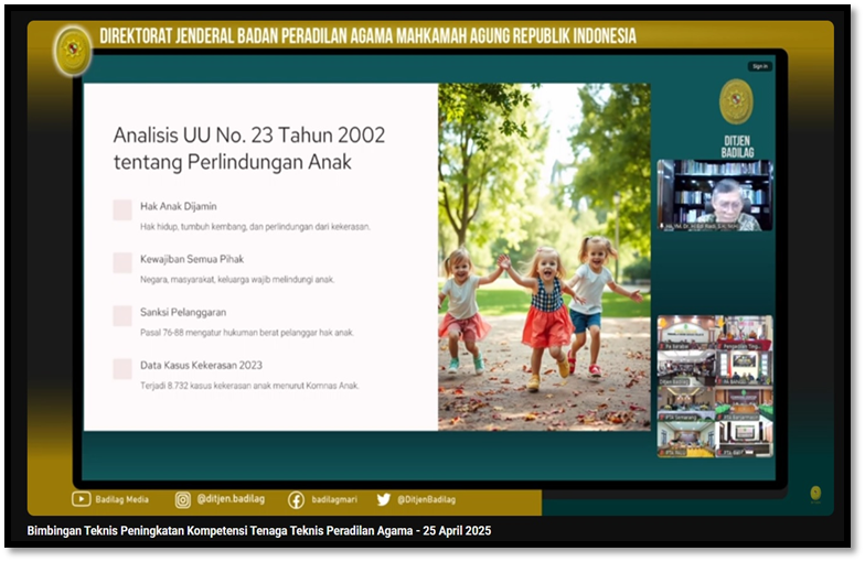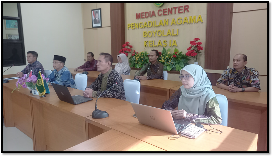 Pengadilan Agama (PA) Boyolali terus menunjukkan komitmennya dalam meningkatkan kualitas pelayanan dan keadilan bagi masyarakat pencari keadilan. Bertempat di Ruang Media Center, Ketua Pengadilan Agama Boyolali Bapak H. Zumrowi, S.Ag, M.H., bersama Wakil Ketua Ibu Rogaiyah, S.Ag, M.H., dan segenap jajaran hakim serta pegawai PA Boyolali mengikuti Bimbingan Teknis (Bimtek) melalui daring yang digelar oleh Direktorat Jenderal Badan Peradilan Agama Mahkamah Agung Republik Indonesia, Jumat (25/04/2025). Bimbingan Teknis dilaksanakan dengan tujuan untuk meningkatkan kualitas dan kapasitas tenaga teknis di lingkungan peradilan agama dalam permasalahan teknis yustisial. Tema yang diangkat dalam bimbingan teknis kali ini yaitu “Perlindungan Hak Asasi Manusia dalam Penyelesaian Hukum Keluarga".