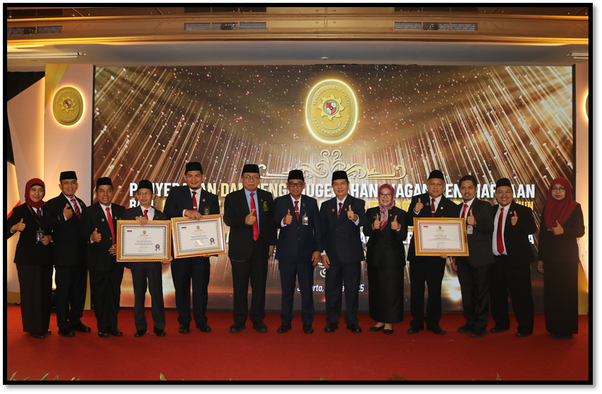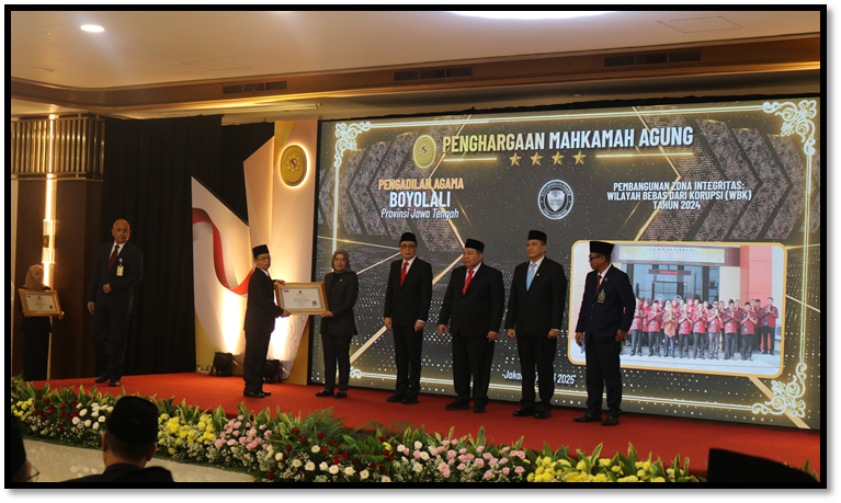 Jakarta - Mahkamah Agung Republik Indonesia menyelenggarakan Penyerahan dan Penganugerahan Piagam Penghargaan bagi 30 pengadilan berprestasi Tahun 2024 yang dilaksanakan bertempat di Balairung Mahkamah Agung, Jakarta, pada Selasa, 6 Mei 2025. Acara ini merupakan bentuk apresiasi dan penghargaan dari MA-RI kepada satuan kerja yang secara konsisten melaksanakan tugas pokok dan fungsi peradilan dengan integritas tinggi serta pelayanan prima kepada masyarakat pencari keadilan. Kegiatan yang dihadiri oleh pimpinan Mahkamah Agung RI, para Ketua Kamar, para Hakim Agung, Pejabat Eselon I dan Eselon II serta pimpinan dan pejabat pada Kementerian Pendayagunaan Aparatur Negara dan Reformasi Birokrasi (KemenPANRB). Ketua Pengadilan Agama Boyolali Bapak H. Zumrowi, S.Ag, M.H., didampingi Panitera Bapak Drs. Aziz Nur Eva, Sekretaris Ibu Fitri Sayekti, S.T., S.H., M.M. dan Kasubbag Perencanaan TI & Pelaporan Bapak Indra Permana, S.Kom, M.H., turut menghadiri langsung acara penyerahan dan penganugerahan tersebut.